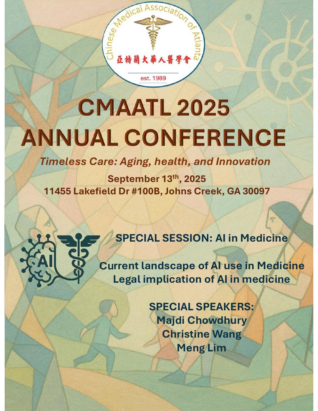 The Chinese Medical Association of Atlanta (CMAATL) proudly celebrates the successful conclusion of its 2025 Annual Conference, held on September 13th at the Johns Creek Event Center. Under the timely and inspiring theme, “Timeless Care: Aging, Health, and Innovation,” the event brought together a vibrant community of medical professionals, innovators, and industry leaders for a day of profound learning, collaboration, and connection.